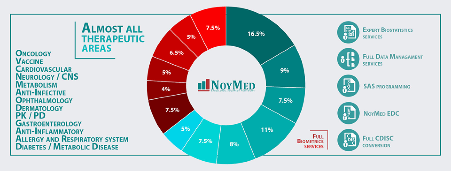 NoyMed is a niche Contract Research Organization that provides full Biometrics, (Biostatistics, Data management and SAS programming), to pharmaceutical, biotech and CRO companies Worldwide. Our staff has over 8 years of experience. We have large-scale experience in almost all therapeutic areas, from phase I to phase III of clinical development pipeline. Our Data Management team provides full data management services from database build to database lock. We work with various EDC systems depending on your preference, such as OpenClinica, Medrio, Medidata Rave, Oracle Clinical, Informy, etc. Our SAS programmers do SDTM, ADaM, TFL, up to define.xml-s, so, full CDISC conversation and prepare FDA/EMA submission-ready packages. Our biostatisticians handle Statistical Analysis Plan, TFL shells and Statistical Analysis Report