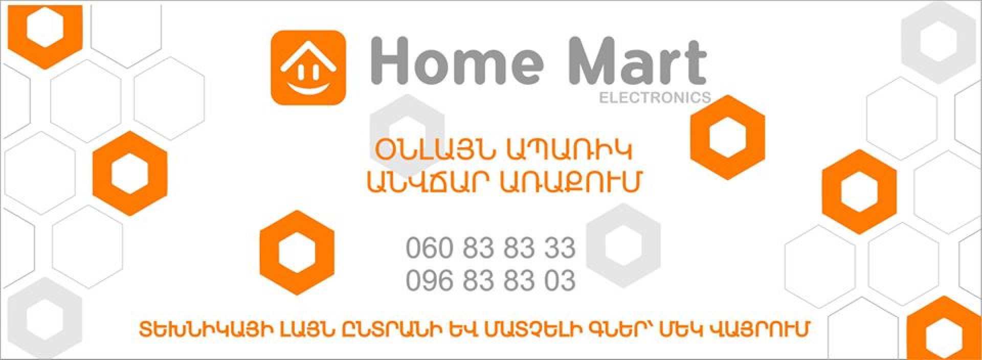 Home mart կենցաղային տեխնիկայի խանութը ստեղծվել է մեկ վայրում միավորելու բազմաթիվ աշխարհահռչակ բրենդերի։ Դուք կարող եք գտնել կենցաղային տեխնիկայի լայն ընտրանի՝ Ձեր տան ջերմությունն ու հարմարավետությունն ապահովելու համար։ Մեր գները մրցունակ են հայաստանյան շուկայում։ Ցածր գնային քաղաքականության շնորհիվ մենք հնարավորություն ենք տալիս մատչելի գներով կահավորել Ձեր բնակարանը որակյալ կենցաղային տեխնիկայով՝ խնայելով Ձեր միջոցներն ու նյարդերը։ Home Mart-ում հաճախ գործում են նաև զեղչեր, հատուկ առաջարկներ և բոնուսներ, որոնք դարձնում են Ձեր գնումներն էլ ավելի շահավետ։ Մեզ մոտ կարող եք կատարել ինչպես մանրածախ, այդպես էլ մեծածախ գնումներ։